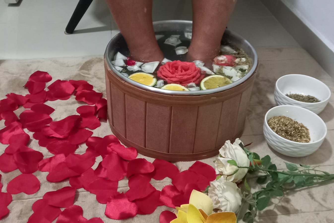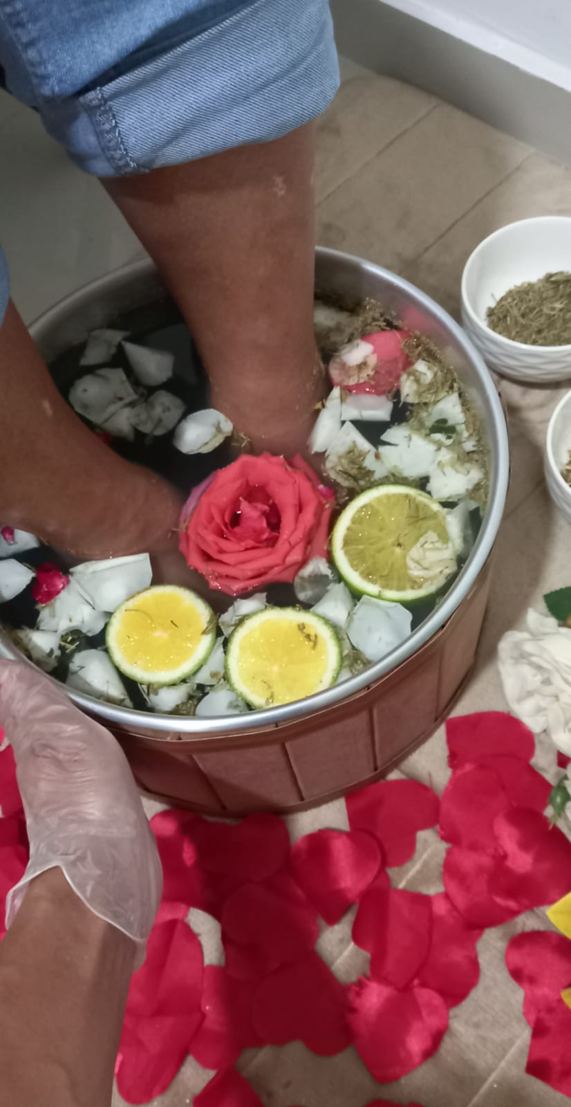 O Spa dos Pés, é um procedimento realizado com a finalidade de higienizar, esfoliar e hidratar os pés ásperos e ressecados, deixando-os limpo, macio e hidratado... É feito com imersão em água morna, com ervas, flores, sais, essências e/ou óleo (de acordo com a necessidade de cada cliente).